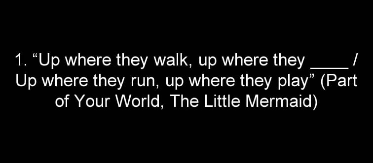 "Up where they walk, up where they ____ / Up where they run, up where they play" (Part of Your World, A Pequena Sereia)
